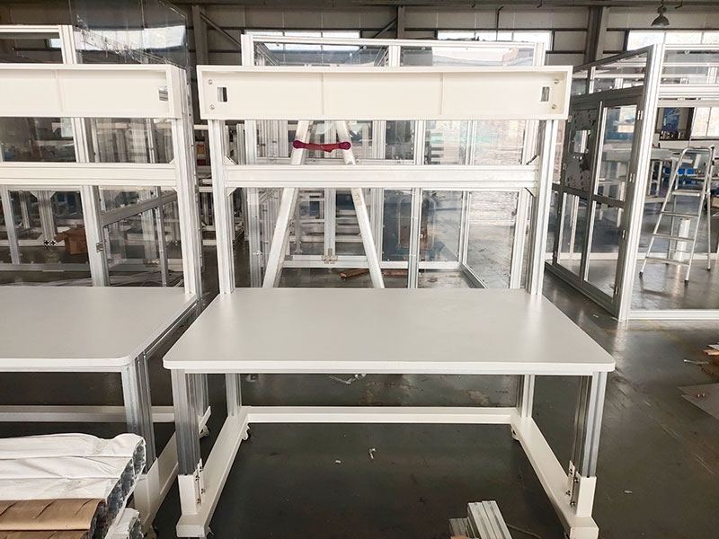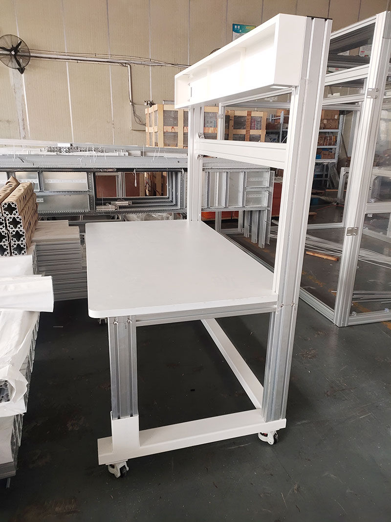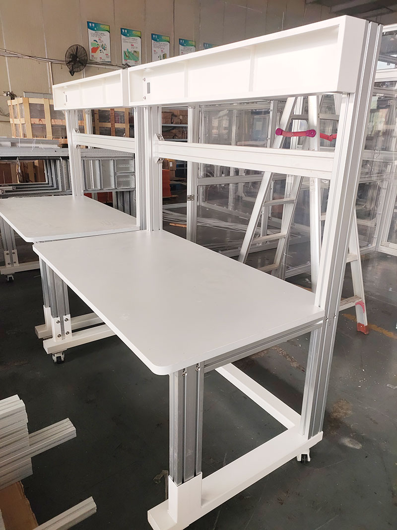 鋁型材工作臺適合于模具、鉗工、檢測、維修、組裝等各種不同應用場合,具有良好的耐腐蝕性,耐臟性,抗沖擊性和承重性。可配合不同的使用要求選擇不同桌面材質;所配置的抽屜、柜門方便使用者存儲工具;桌角上預留電源孔,方便安裝電源插座。工作臺(桌)分為輕型(可承重300公斤),中型和重型工作臺(桌)可承重1000公斤;特制的工作臺可按需定制。可根據(jù)需要靈活地配置各種吊柜、單柜、雙柜等,可加裝掛板,電器板,燈頂板、調節(jié)腳杯,輪子,擱板等桌上部件,具有多種選擇,能夠滿足各種工位的需求。