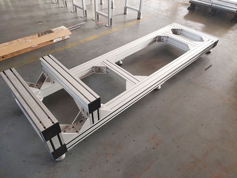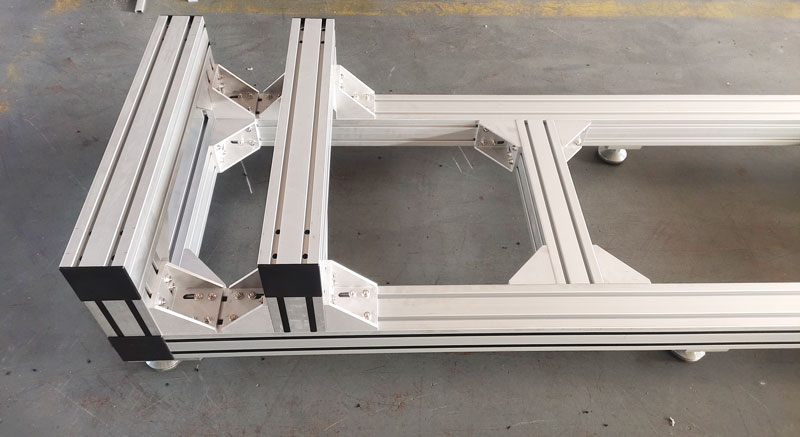 作為工廠精密設備的支撐底座,使用100100鋁型材,非常堅固,底部安裝6個金屬蹄腳,承重力強,外觀精美不生銹,橫梁可調節位置,方便機器安裝。