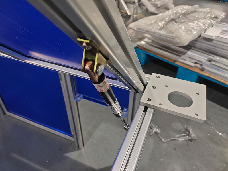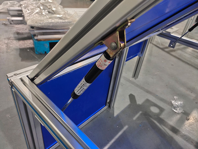 這個鋁型材設備防護罩頂部蓋板可以打開一個角度并固定住,也可以輕輕蓋上。實現這一功能的是蓋板上安裝的氣彈簧。氣彈簧又被稱為支撐桿、氣支撐、調角器、氣壓棒、阻尼器等,是一種可以實現支撐、緩沖、制動、高度及角度調節等功能的零件,在工程機械中,主要應用于罩蓋、門等部位。